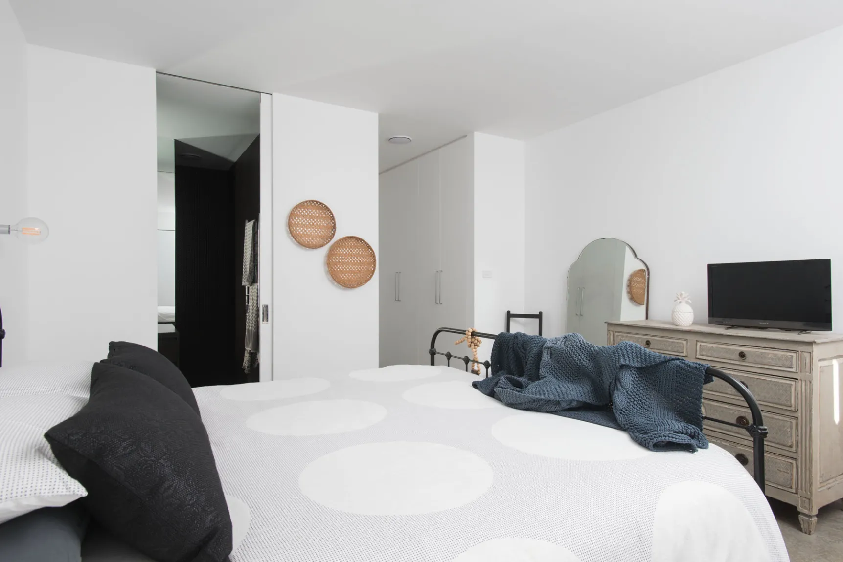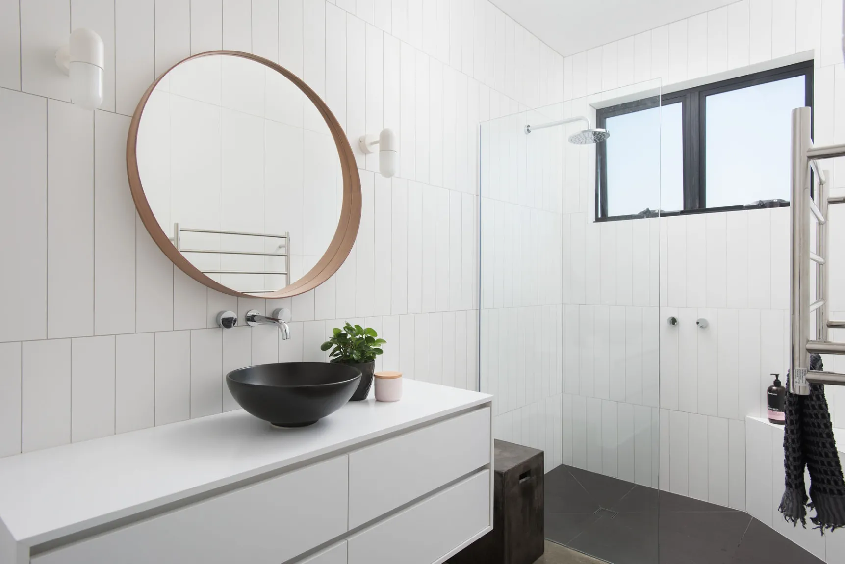 Both bathrooms (main and en-suite) are fully tiled, have floor heating and hard wired heated towel ladders and both also feature bespoke vanity joinery, as does the powder room.
