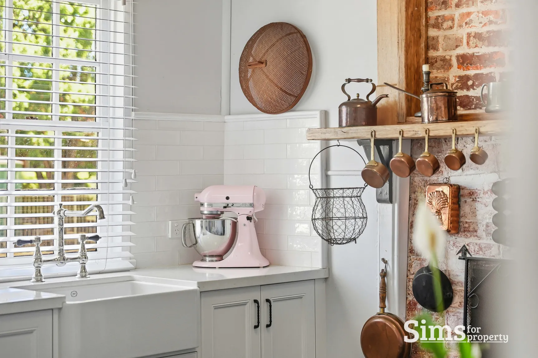 The country-style kitchen forms the heart of the home, blending charm with functionality. Featuring a farmhouse sink, beautiful tapware and quality appliances, the space has been designed for both cooking and connection. Generous storage, including a walk-in pantry, supports day-to-day living and entertaining, while the outlook to the garden reinforces the strong relationship between the home and its outdoor setting.